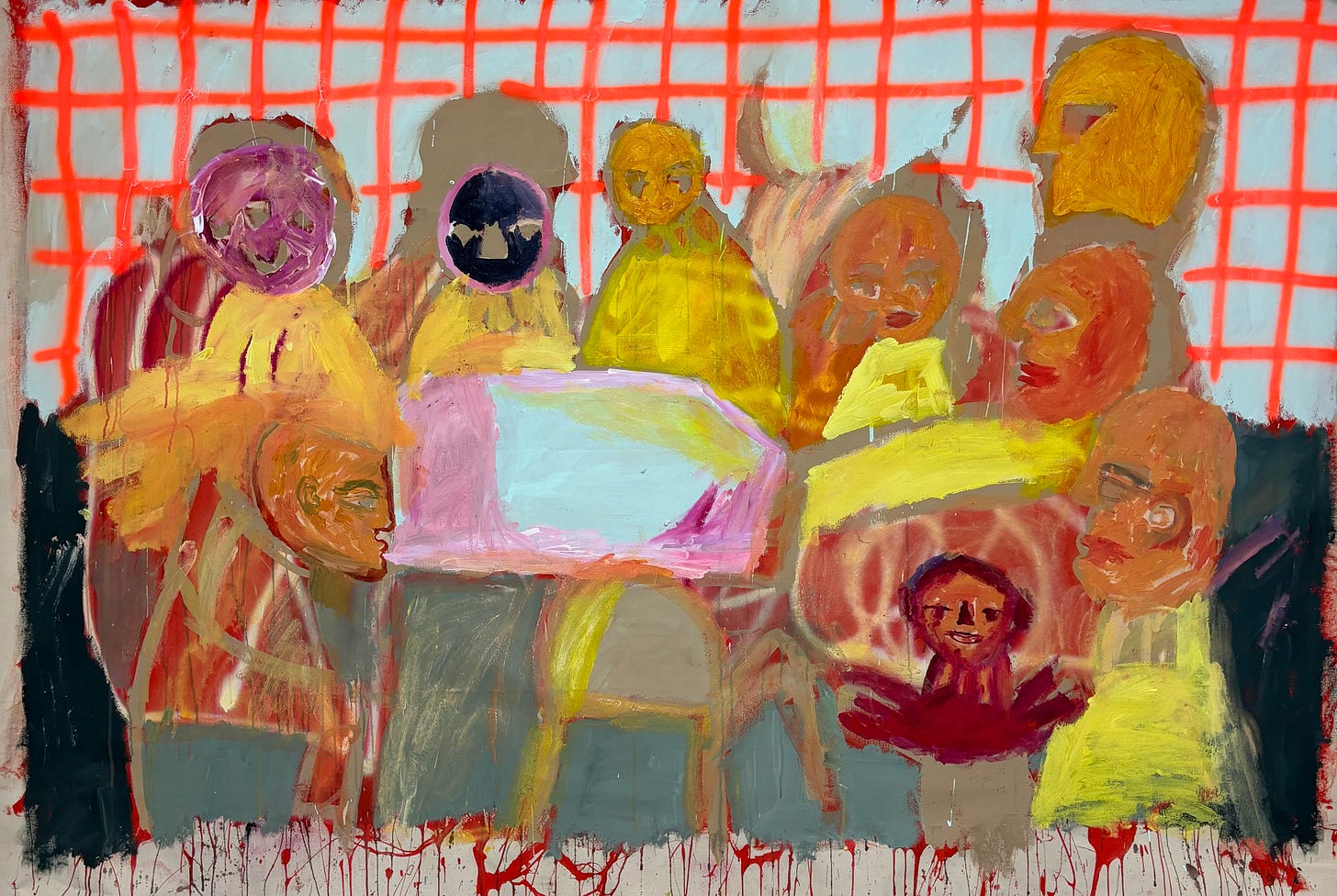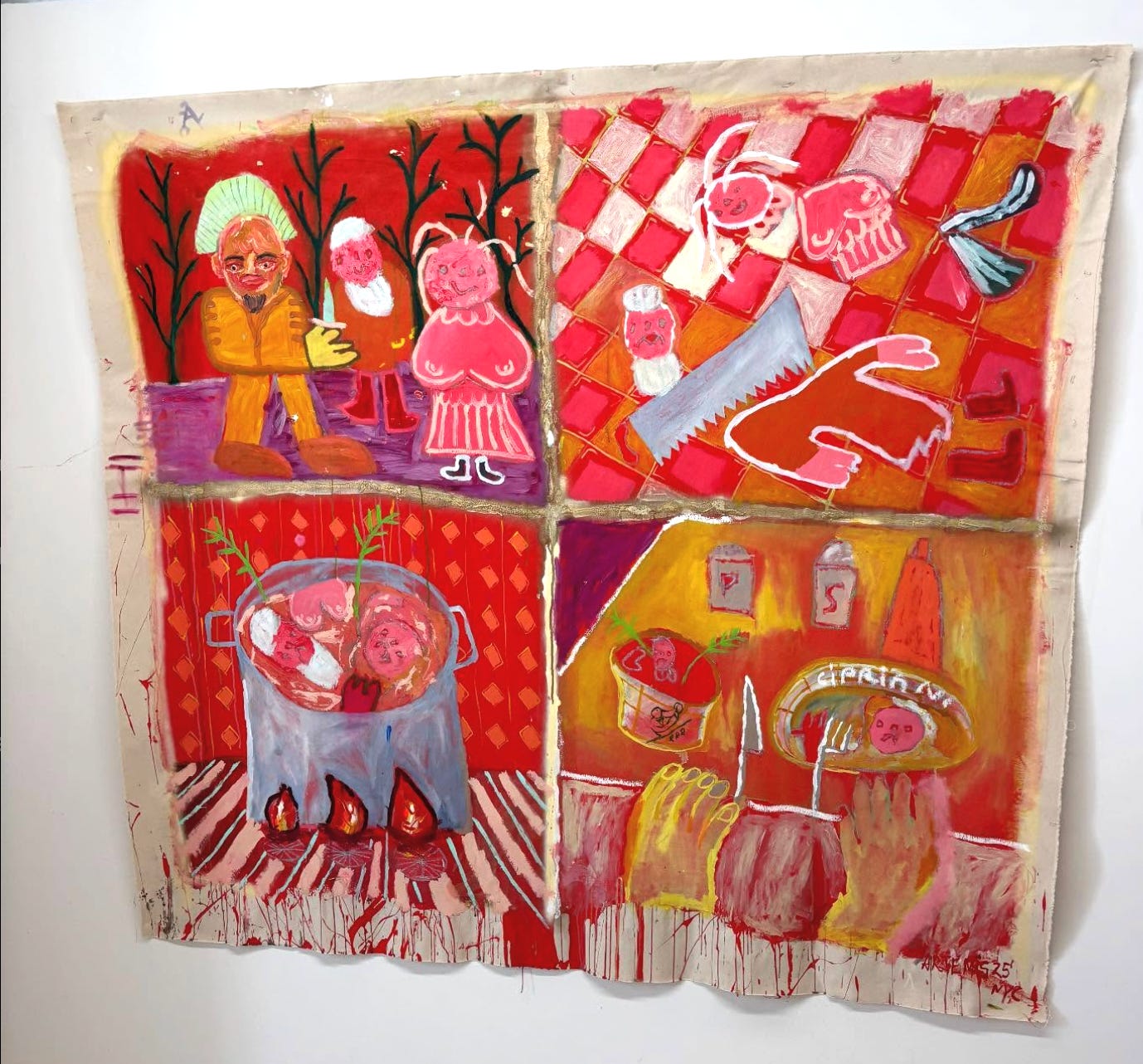 On a strip of 6x6 cloth nailed to a wall, dozens of abstracted bodies congregate on a grey floor. Some lie on cots, others sit together at a table, and someone in the bottom-right corner screams with hands held high. The deranged painting, made with acrylic and charcoal, is called “Common Cell Room.” It depicts living conditions in the Moshannon Valley Processing Center, the largest ICE detention facility in the northeast. Its creator, a Targaryen-looking 28 year-old, makes sure to point out a fallacy in the building’s name: “It is not a processing center. It is a prison.”