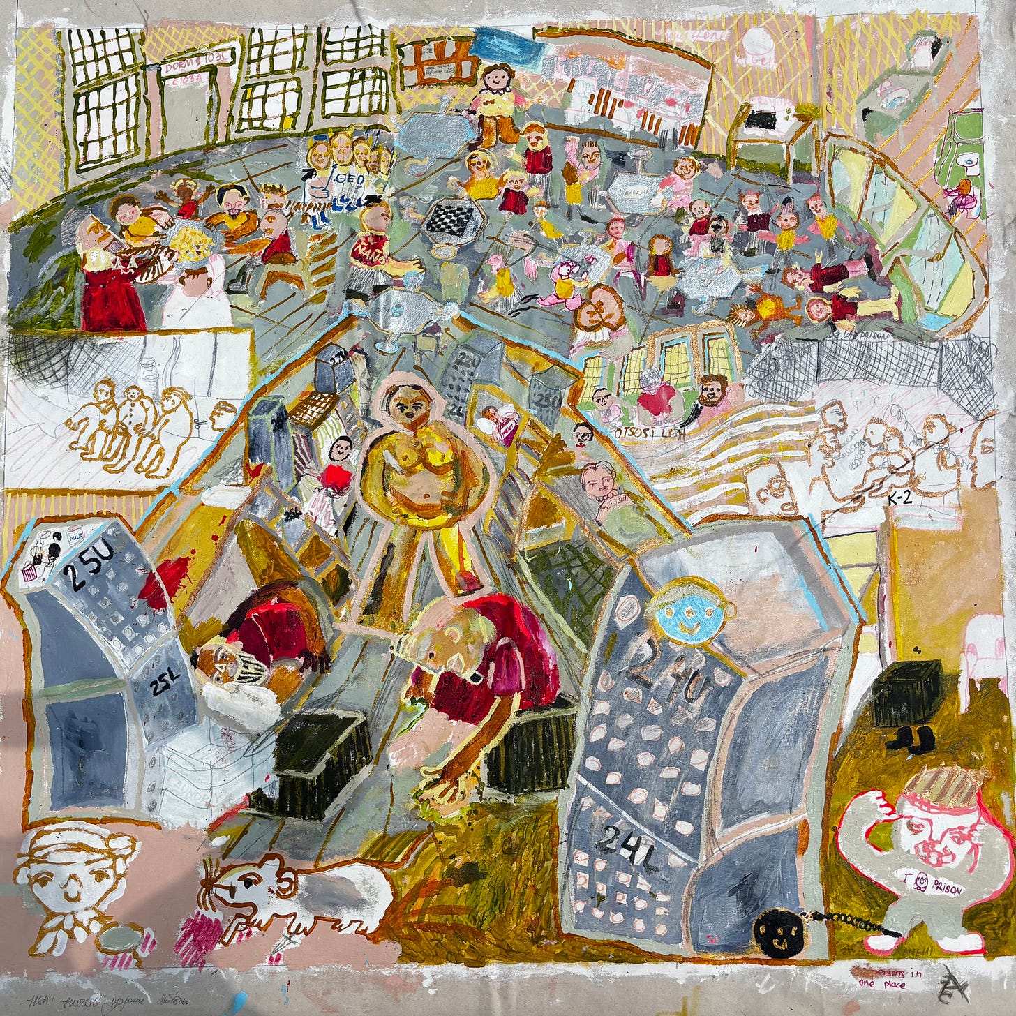 When speaking about “Common Cell Room,” his tone flipped. His eyes got twice as big and his voice tensed with frustration while pointing hard at areas of the painting: “One row, two row, three row, four row, 60 people, one big common room. Always phone calls, always fights in the bathroom, people taking shits, fights over the microwave…Listen, see this,” he jabs his finger on a figure in red slouched down, “they use a piece of the dice tube, this one crazy person from El Salvador, a real thug, he was scraping the dice tube on the floor every day to sharpen it. Everyday, day and night, nonstop. He made money from it.”